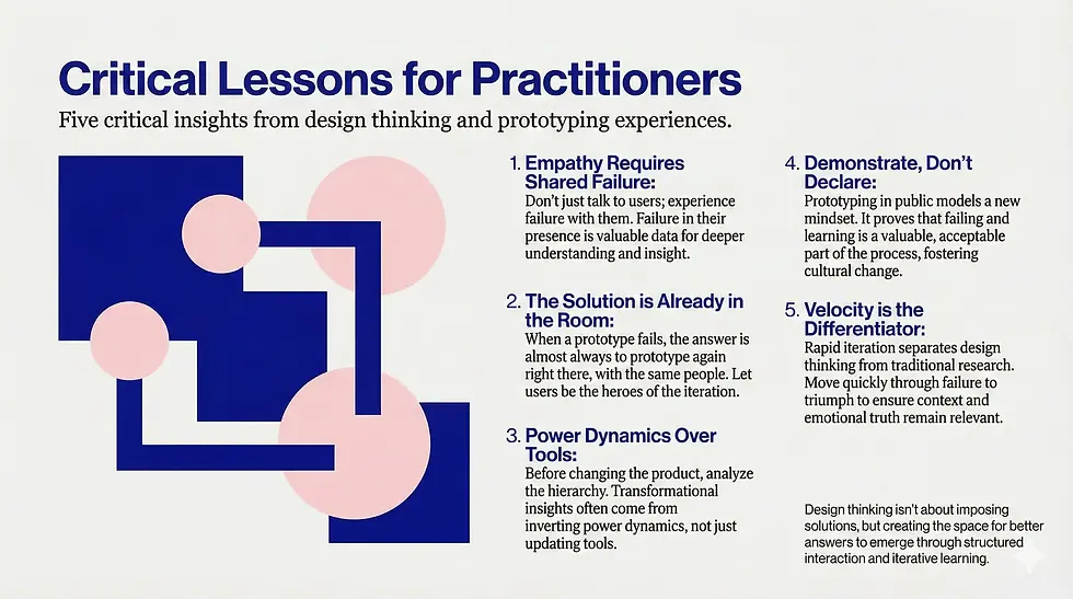 The VisionSpring case reminds us that design thinking isn't about having brilliant insights in isolation. It's about creating the conditions for insights to emerge through structured interaction with the people we're designing for.